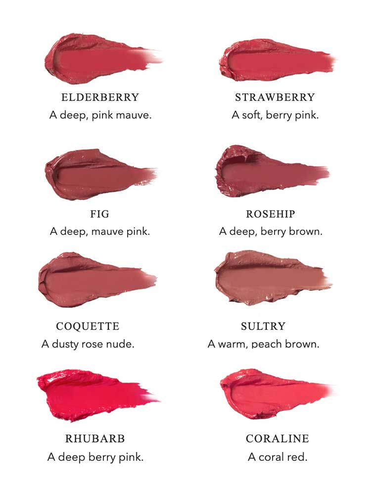 Ricinus Communis (Castor Seed) Oil, Octyldodecanol (From Coconut Oil), Euphorbia Cerifera (Candelilla) Wax, Caprylic/Capric Triglyceride, Hydrogenated Castor Seed Oil, Dimer Dilinoleate (From Plants), Tocopherol (Vitamin E), Butyrospermum Parkii (Shea) Butter, Persea Gratissima Oil, Persea gratissima (Avocado) Oil, Prunus Armeniaca Kernel Oil, Prunus Armeniaca (Apricot) Kernel Oil, Theobroma Cacao (Cocoa) Seed Butter, Fragaria Ananassa (Strawberry) Fruit Extract, Punica Granatum (Pomegranate) Fruit Extract, Vaccinium Myrtillus Fruit (Billberry) Extract, Rubus Idaeus (Raspberry) Fruit Extract, Vitis Vinifera (Grape Skin) Extract, Vaccinium Angustifolium (Blueberry) Fruit Extract, Rubus Fruticosus (Blackberry) Fruit Extract, Beta Vulgaris (Beet) Root Extract, Rubus Leucodermis (Black Raspberry) Extract, Euterpe Oleracea (Acai) Fruit Extract, Bixa Orellana (Annato) Seed Extract, Daucus Carota Sativa (Carrot) Root Extract, Prunus Cerasus (Cherry) Extract, Curcuma Longa (Turmeric) Root Extract, Active Carbon (Activated Bamboo Charcoal). May contain: Iron Oxides, Manganese Violet