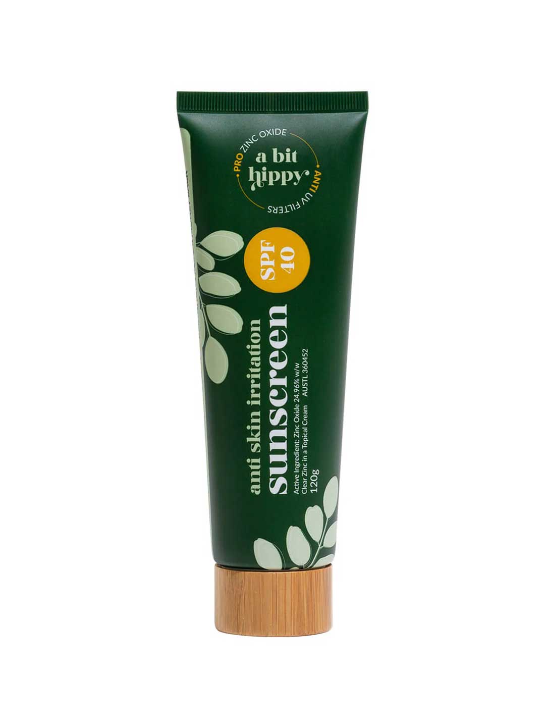 The A Bit Hippy Anti Skin Irritation Sunscreen SPF40 is a naturally derived zinc sunscreen that acts as a barrier to help reflect the sun's rays back into the atmosphere. Formulated with Zinc Oxide, this non-greasy sunscreen provides broad spectrum protection and is suitable for use on body, face, and sensitive skin. Gentle enough for babies and the whole family, this reef-safe formula is kind to both skin and planet. Perfect for outdoor activities while providing reliable sun protection. Made in Australia, vegan and TGA Listed (AUST L 360452). ALWAYS READ THE LABEL. FOLLOW THE DIRECTIONS FOR USE. Sunscreen is only one part of sun protection; wear protective clothing and seek shade. Avoid prolonged sun exposure and reapply frequently.