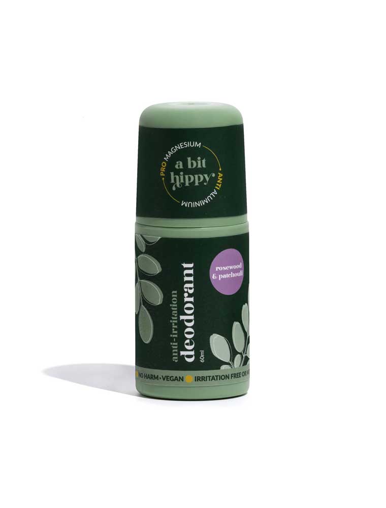 Green deodorant bottle with 'a bit hippy' branding on a white background