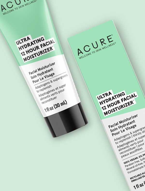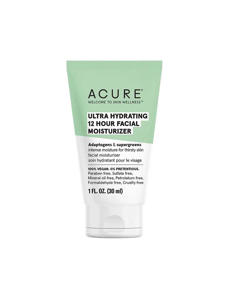 The Acure Ultra Hydrating 12 Hour Facial Moisturiser is designed to provide continuous hydration for up to 12 hours. This advanced formula contains Hyaluronic Acid with an adaptogenic blend of Ashwagandha, Reishi, and Holy Basil, plus supergreens Kale and Spinach to help maintain skin moisture levels while soothing and de-stressing thirsty skin throughout the day. The lightweight texture absorbs quickly while creating a protective barrier that helps prevent moisture loss. Made in the USA and vegan.
