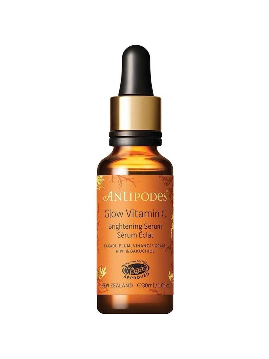 The Antipodes Glow Vitamin C Brightening Serum is a vitamin C serum with bakuchiol and hyaluronic acid ideal for dull skin concerned with uneven tone and lack of radiance. This easily absorbed luxurious facial formula contains Vitamin C-rich Kakadu Plum, shown to contain 100 times the Vitamin C of oranges, Bakuchiol and Hyaluronic Acid which work together to improve the appearance of dull skin and enhance skin hydration whilst delivering brightening and anti-ageing benefits. The lightweight gel texture absorbs quickly, leaving the skin feeling plump and dewy for a naturally luminous complexion. Free from silicone and mineral oil. Made in New Zealand, vegan and packaged in glass.