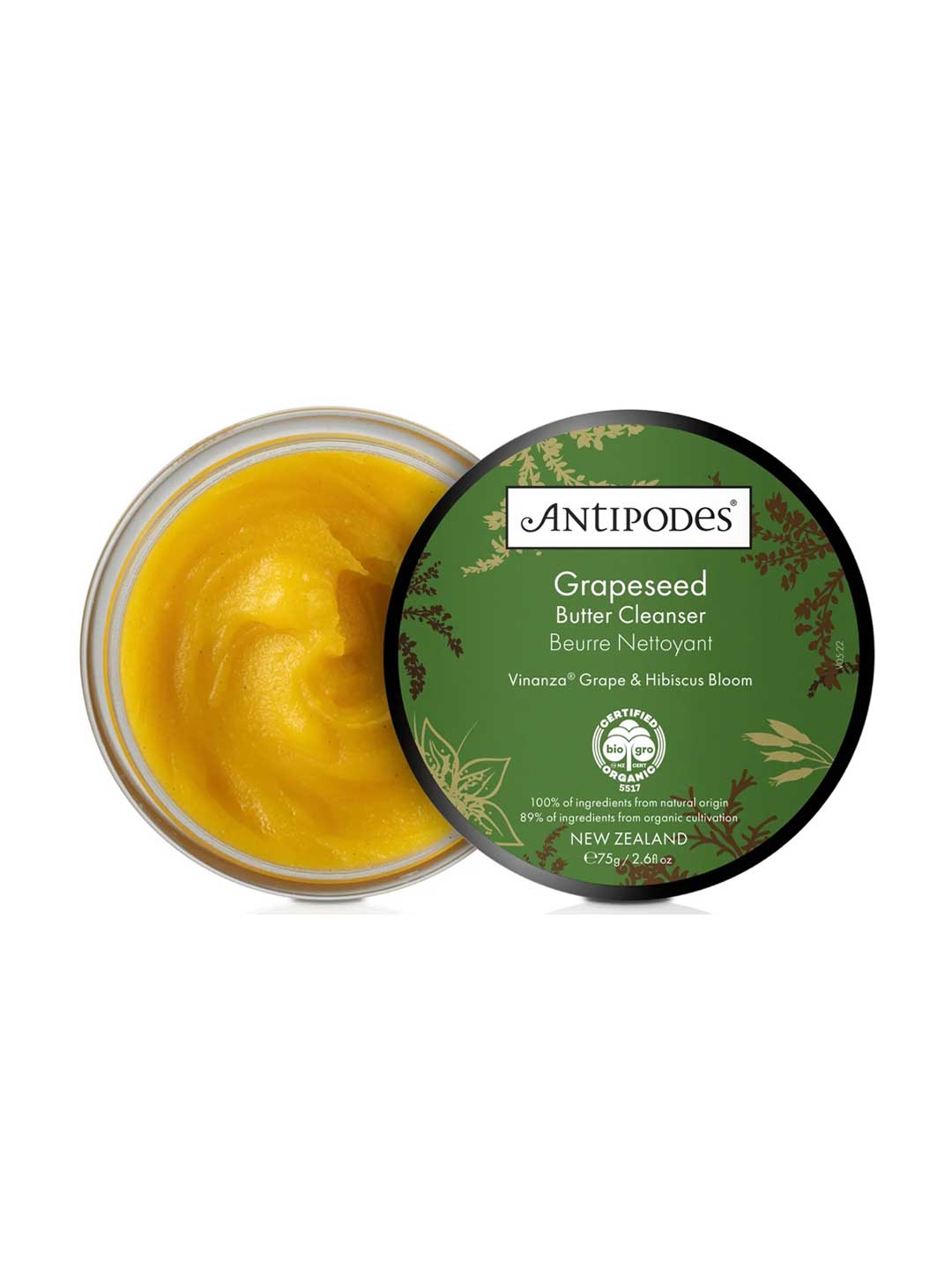 The Antipodes Grapeseed Butter Cleanser is an ultra-rich organic balm cleanser and makeup remover that nourishes dry skin whilst lifting away all traces of makeup and impurities. This sulfate-free luxurious balm is crafted with nourishing Cacao Butter, Olive and Harakeke Oils, soothing Blue Chamomile and Lavender to help calm sensitive skin. Enriched with Vinanza Grape, known for its high antioxidant content to help brighten the complexion and boost radiance. The Vinanza Grape seeds contain double the levels of polyphenolic antioxidants of grapes grown anywhere else in the world, providing exceptional antioxidant benefits. The rich, buttery texture melts into the skin for thorough yet gentle cleansing. Free from harsh chemicals, sulfates and artificial fragrance. Made in New Zealand and certified organic.