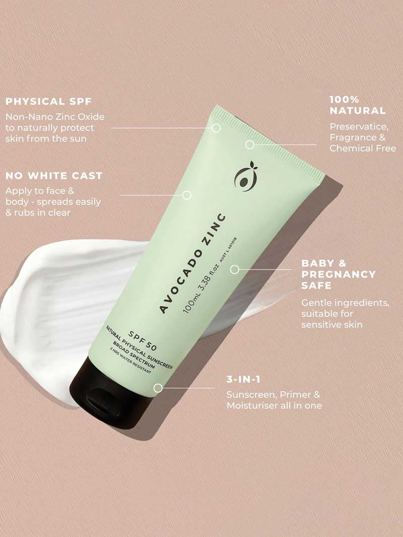 The Avocado Zinc SPF 50 Natural Physical Sunscreen uses non-nano zinc oxide to safely protect the skin from UVA and UVB rays. This 3-in-1 facial sunscreen, moisturiser and primer contains a special blend of skin boosting ingredients including Avocado Oil, Coconut Oil, Vitamin E, Calendula Oil and Castor Oil, to soothe and moisturise the skin without weighing it down or leaving it oily. This preservative-free and fragrance-free formula rubs in clear with no white cast and is 2 hours water resistant. The plant oils used are 98% non-comedogenic and do not block pores, with formulas that quickly absorb into the skin, leaving a dewy moisturised complexion. Made in Australia and vegan. TGA Listed (AUST L 401018). ALWAYS READ THE LABEL. FOLLOW THE DIRECTIONS FOR USE. Sunscreen is only one part of sun protection; wear protective clothing and seek shade. Avoid prolonged sun exposure and reapply frequently.