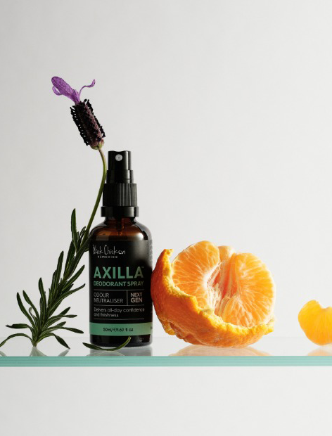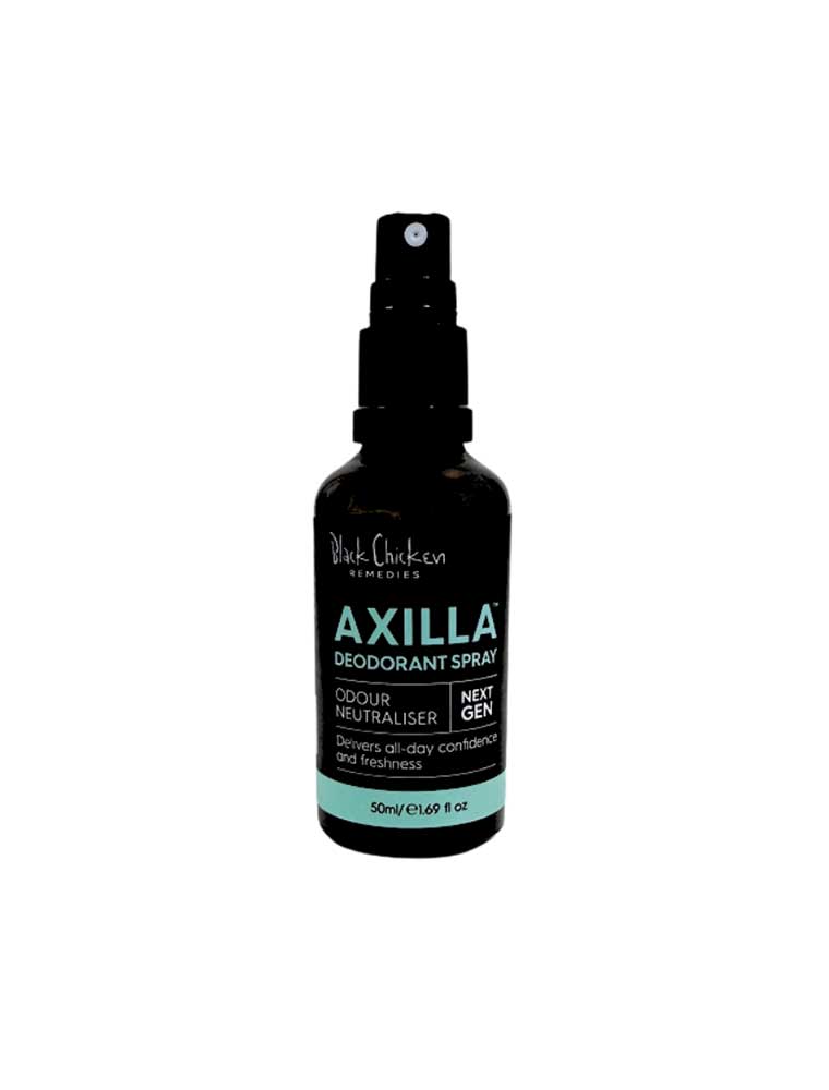 The Black Chicken Remedies Axilla Natural Deodorant Spray combines effective natural ingredients with convenient application for on-the-go freshness. This advanced formula features Zinc Sulphate and Magnesium Chloride to help provide natural freshness, while soothing Lavender Water and astringent Witch Hazel help care for and condition the skin. This non-aerosol spray applies invisibly with a refreshing spicy scent and is designed not to mark clothes. Made in Australia and vegan.