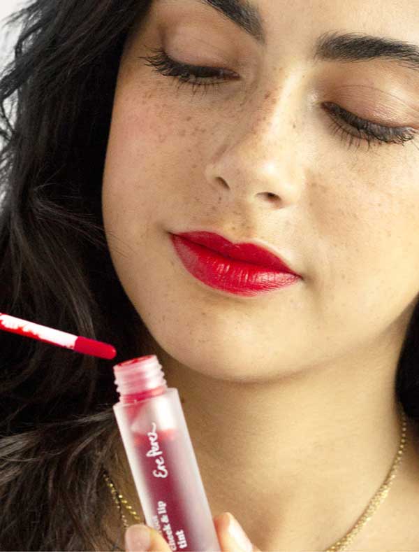 3. Blend tint fast with our eco vegan multipurpose brush, one side at a time. For a deeper red, reapply another layer and blend well