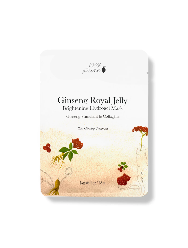 The 100% Pure Ginseng Royal Jelly Mask is a brightening facial treatment designed to support skin brightness and vitality. Formulated with Korean Red Ginseng and Royal Jelly plus nourishing Manuka Honey, Peony extracts and Vitamin C. The hydrogel material is composed of 95% organic Aloe Vera juice and 5% plant cellulose for intensive moisture delivery. Suitable for all skin types.