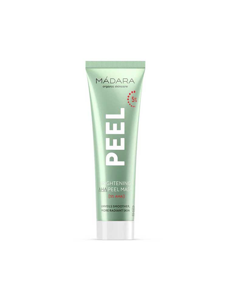 The Madara Peel Brightening AHA Peel Mask gives instant radiance with nature's superdose of active acids for brighter, more radiant skin. This powerful formula features fruit acids and Vitamin C from Quince fruit, blended with hydrating Lactic Acid and soothing Elderflower to provide efficient exfoliation whilst maintaining skin comfort. The mask removes dead cells to uncover smoother, more radiant skin surface, exfoliates to stimulate cell turnover and regeneration, and brightens skin whilst targeting the appearance of age spots and lines. It helps unclog pores for deep cleansing action and improves the absorption and effect of other cosmetic products. Especially beneficial for those with dull, tired skin, signs of ageing, lines, wrinkles, age-spots, lack of glow, or clogged pores. Not suitable for fragile or hypersensitive skin. Made in Latvia, certified natural and vegan.