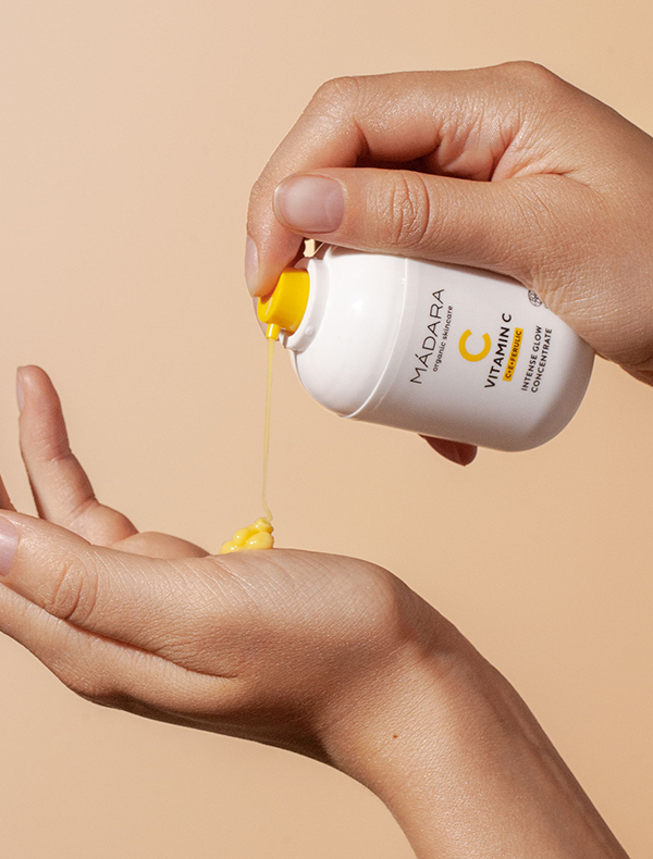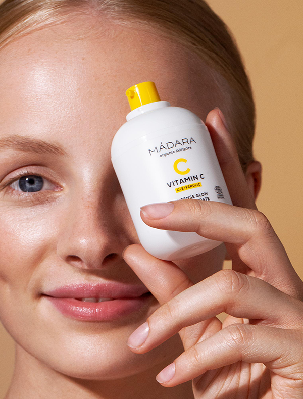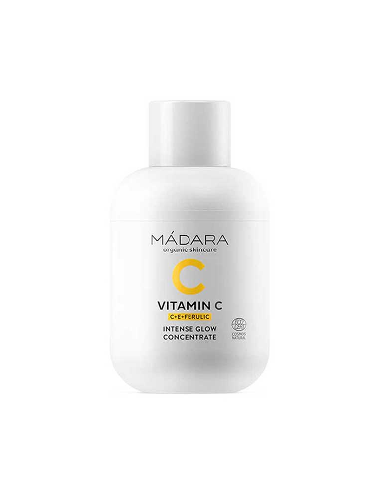 The Madara Vitamin C Intense Glow Concentrate is a brightening essence that gives your skin an intense glow, based on a blend of Ferulic Acid and Vitamins C+E. This potent concentrate features Ascorbic Acid Glucoside, a highly active and stabilised form of Vitamin C to brighten dull skin and promote a more even skin tone. Enhanced with Ferulic Acid to help support skin against free radical damage and signs of premature ageing such as fine lines, wrinkles and dark spots whilst smoothing the skin's surface to improve firmness. Tocopherol, a natural form of Vitamin E, provides skin-soothing and hydrating abilities that promote radiance and combat free radical damage. Clinical testing shows 100% confirm it brightens the skin and 95% say it promotes a more even skin tone after 8 weeks of use. Additional studies show 91% confirm a brighter, better-looking complexion and 96% would recommend to others. Dermatologically tested. Made in Latvia, certified natural and vegan.