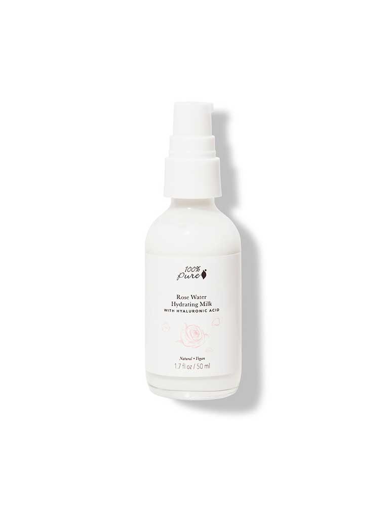 The 100% Pure Rose Water Hydrating Milk is ideal for oily, combination and sensitive skin types. This soothing, lightweight facial moisturiser features calming Rose Hydrosol to tone and refresh the complexion, alongside Hyaluronic Acid for optimal hydration and Olive Squalane to lock in moisture without heaviness. Enhanced with Beta Glucan to help calm and soothe reactive skin, this gentle formula provides essential hydration while helping to balance the skin. The milky texture absorbs quickly without clogging pores, making it perfect for those who prefer a lighter moisturiser or have skin that reacts to richer formulations. Made in the USA and vegan.