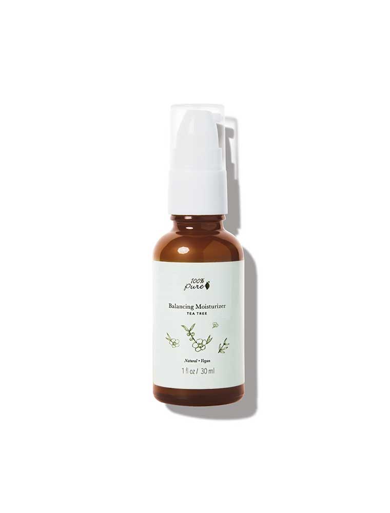 The 100% Pure Tea Tree Balancing Moisturiser is specifically designed for oily and blemish-prone skin types. This lightweight, quick-absorbing formula features clarifying herbs to refresh, soothe, and balance acnegenic skin. Enhanced with Tea Tree to help clear impurities and tone, Neem to help address the appearance of acne marks, and Green Tea to tone with antioxidant benefits. The gel-based texture includes Turmeric Extract to help brighten the appearance of skin, Azelaic Acid to reduce pore-clogging debris and cooling Peppermint Oil to provide a refreshing sensation. Made in the USA, vegan and packaged in glass.