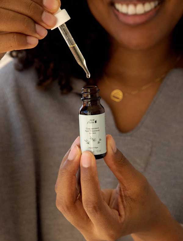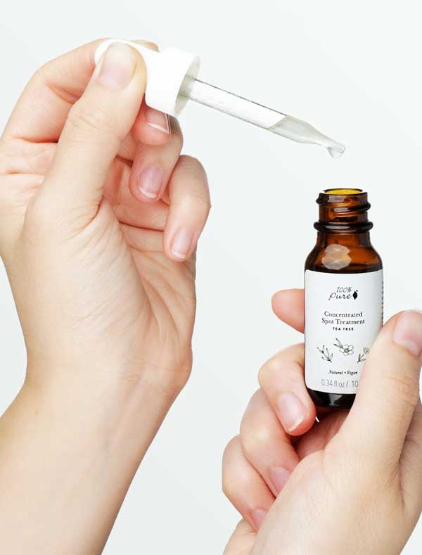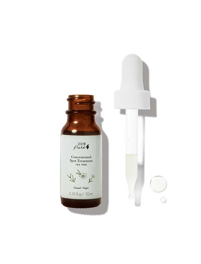 The 100% Pure Tea Tree Concentrated Spot Treatment is specifically designed for oily and blemish-prone skin types. This spot lotion features concentrations of Tea Tree, Neem, Eucalyptus and Peppermint essential oils plus Witch Hazel and Lactic Acid which work together to tackle belmishes and excess oil production. This spot treatment can be reapplied several times daily or as needed to specific areas. Made in the USA, vegan and packaged in glass.