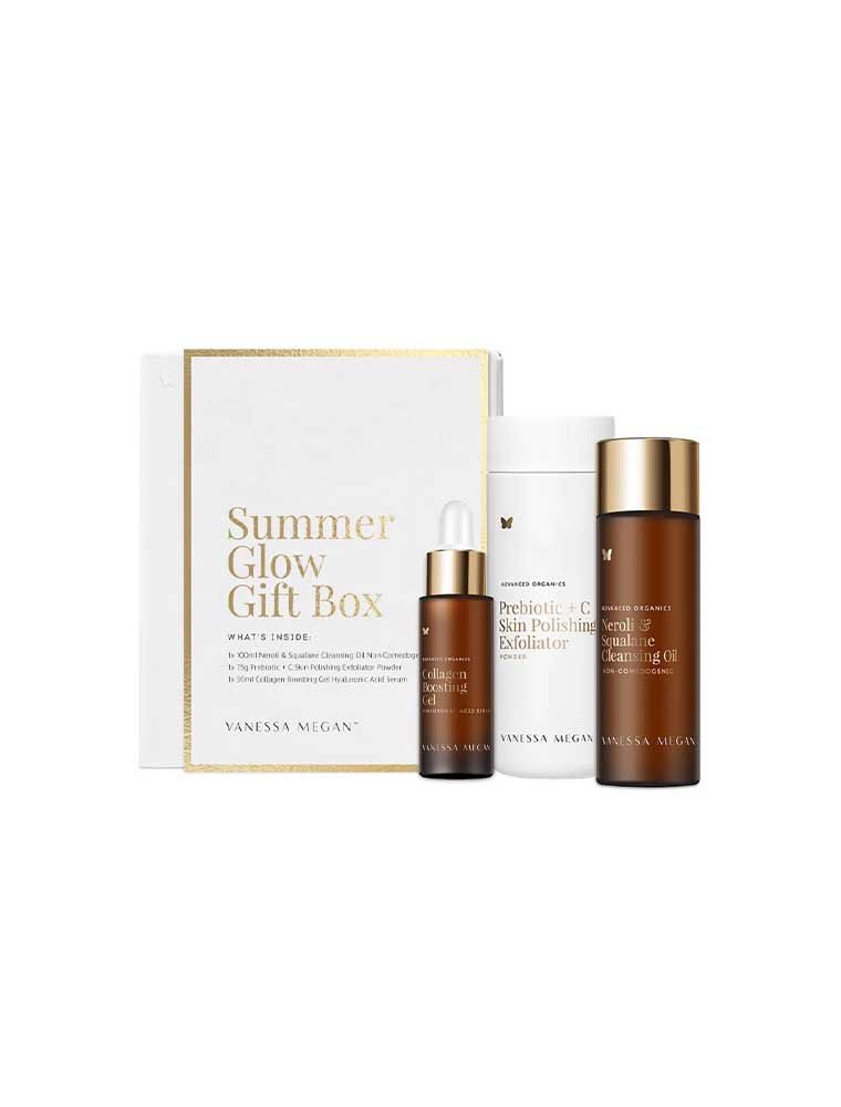 The Vanessa Megan Summer Glow Gift Pack is a comprehensive skin transformation system designed to cleanse, exfoliate, and rejuvenate. Ideal for all skin types, this set contains a full size Neroli and Squalane Cleansing Oil, Prebiotic + C Skin Polishing Powder, and the Collagen Boosting Gel featuring Hyaluronic Acid and Australian natives like Kangaroo Paw and Banksia. This complete ritual combines powerful natural actives to deliver deep hydration, gentle exfoliation, and enhanced elasticity for smoother, brighter, and more youthful-looking skin. The perfect gift for anyone wanting to experience the full Vanessa Megan skincare ritual. Made in Australia and packaged in glass.