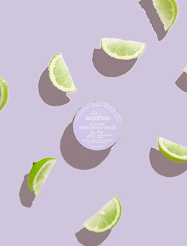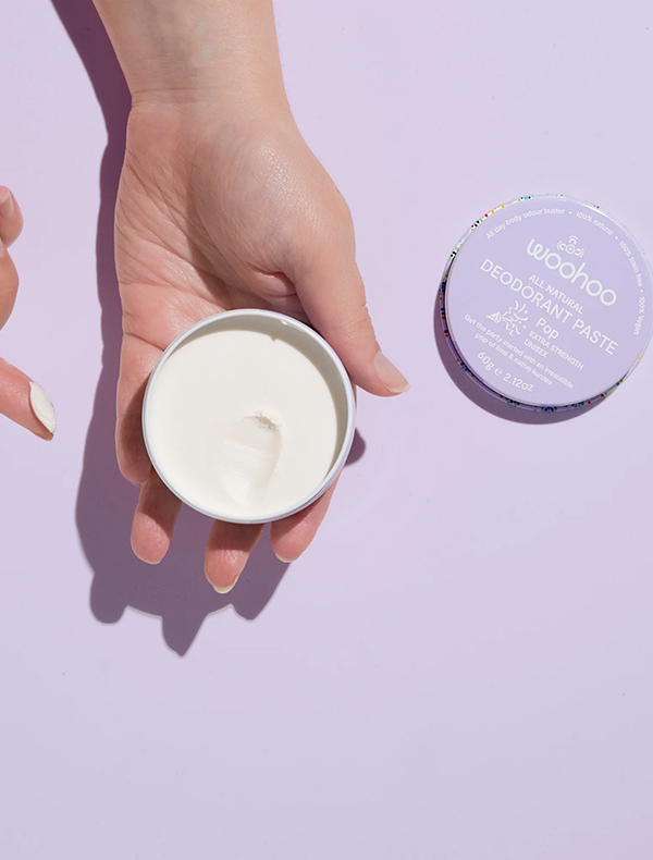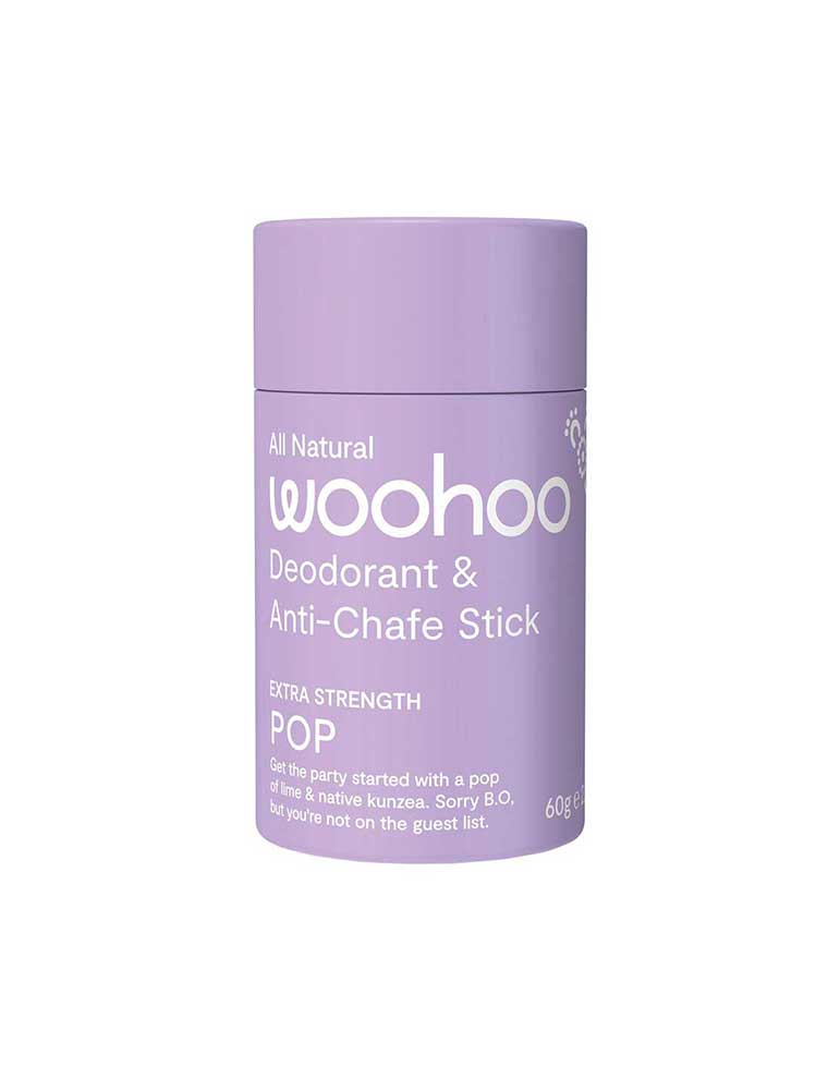 The WooHoo Deodorant in Pop is an extra strength natural deodorant and anti-chafe stick that delivers maximum protection with an energising citrus kick. This aluminium-free formula features a vibrant blend of lime and grapefruit using 100% pure essential oils, perfect for those who want both superior protection and an invigorating scent experience. This extra strength stick provides all-day freshness with the convenience of smooth, easy application. The advanced formulation uses natural ingredients including Shea Butter and Zinc to protect your skin's barrier while delivering extra-strength odour control that rivals traditional antiperspirants. Won't leave white marks or stains, doesn't sting after shaving. Comes in biodegradable cardboard packaging for environmental sustainability. Made in Australia, vegan and packaged in cardboard.