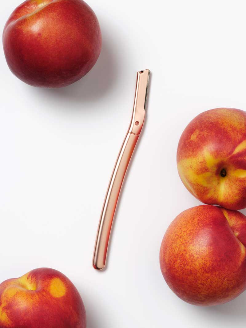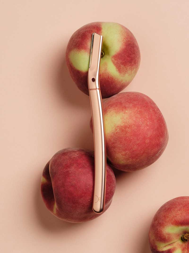 Start with a clean, dry face. Hold the skin taut, and with the dermaplaner at a 45-degree angle. Apply short, feathery strokes downward with light pressure. This is a sharp blade so use with caution and keep out of reach from children.