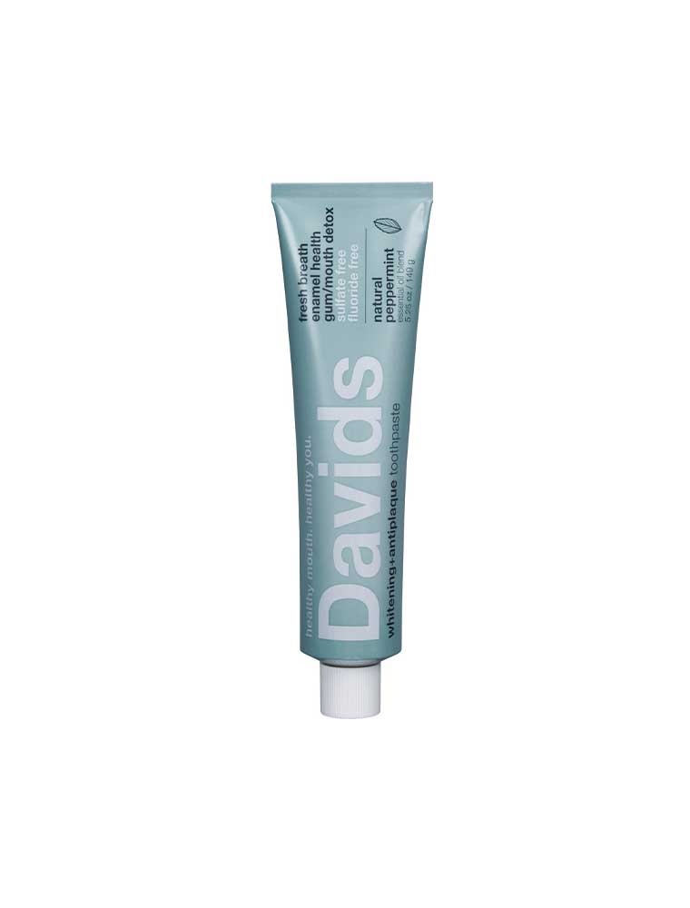 The Davids Whitening + Antiplaque Peppermint Toothpaste delivers effective oral care through thoughtfully selected natural ingredients. This premium formula combines whitening benefits with antiplaque properties for comprehensive daily dental maintenance. The refreshing taste comes from natural peppermint oil extracted through steam distillation, preserving the essence of the mint leaves in their natural state. Davids carefully sources ingredients that undergo minimal processing, such as calcium carbonate derived from limestone, to gently polish teeth. Every ingredient is designed to naturally remove plaque, whiten teeth, and freshen breath. Made in the USA and vegan.