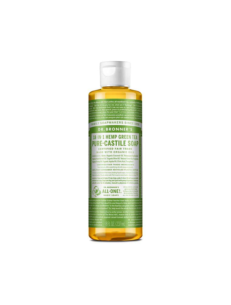 The Dr. Bronner's 18-in-1 Pure-Castile Hemp Soap in Green Tea is a multi-use liquid soap made from organic and certified fair trade ingredients for all your cleaning needs. This concentrated soap is fresh and bright, offering the perfect pick-me-up for your cleaning routine. Use it for everything from personal care to household cleaning. Whether you're washing your face, body, shampooing your hair, doing laundry, mopping floors, washing dishes, or even bathing pets. Simply dilute as needed. Made in the USA and vegan.