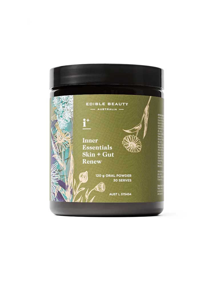The Edible Beauty Inner Essentials Skin + Gut Renew Powder combines herbs with targeted nutrients for complete digestive and skin health. This naturopathic formula features protein-digesting Protease enzymes and gut-supporting L-Glutamine, alongside liver-cleansing Silybum Marianum and soothing Matricaria Chamomilla. Enhanced with calming Aloe Vera polysaccharides, protective Slippery Elm bark, and skin-supporting Vitamin C. Perfect for addressing both internal and external wellness, this powder helps relieve digestive discomfort while supporting immune function, collagen formation, and overall skin health. Lab-tested for purity. Made in Australia, packaged in glass. TGA Listed (AUST L ). ALWAYS READ THE LABEL. FOLLOW THE DIRECTIONS FOR USE.