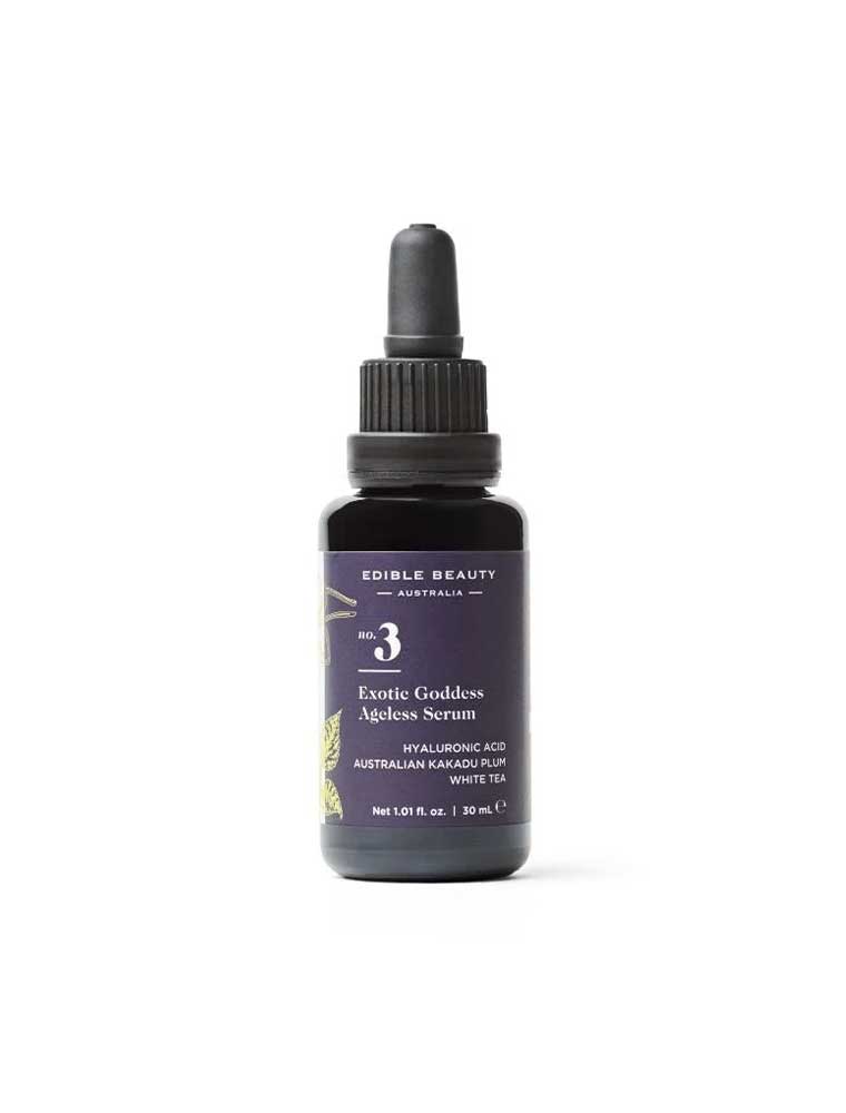 The Edible Beauty No.3 Exotic Goddess Ageless Serum combines clinically validated actives with powerful botanicals. This advanced formula features Superox-C™ from Kakadu Plum, proven to reduce wrinkles by 30% and enhance luminosity by 30% in 30 days. Enhanced with three hydrating ingredients - Hyaluronic Acid holding 1000x its weight in water, moisture-binding Beta Glucan from mushrooms, and polyphenol-rich White Tea Extract. Perfect for comprehensive anti-ageing care, this serum accelerates skin recovery and collagen production while providing deep hydration and UV care for smoother, firmer, more radiant skin. Made in Australia, vegan and packaged in glass.