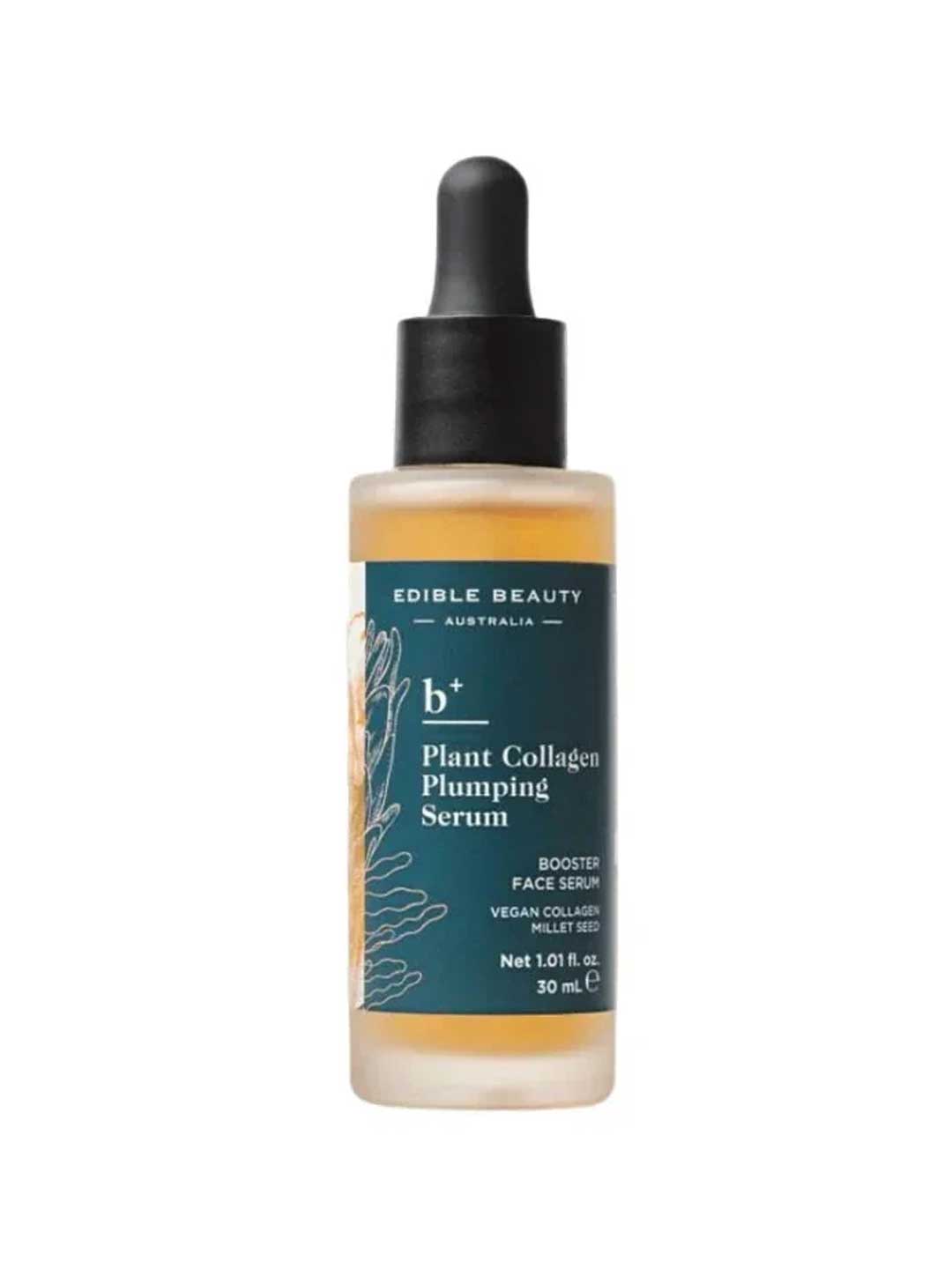 The Edible Beauty Plant Collagen Plumping Serum is a clinically tested anti-aging serum for mature skin that visibly lifts, firms and reduces wrinkle depth. Formulated with wild-crafted Type I Plant Collagen to decrease wrinkle depth, alongside Millet Seed and Oak Extracts that strengthen the collagen matrix. Enhanced with vitamin-rich Australian Kelp, antioxidant Davidson Plum, and super-potent Aniseed Myrtle (100x more powerful than Vitamin C), plus Dragon Fruit Extract for additional firming. This comprehensive serum supports long-term collagen production whilst delivering visible lifting and brightening results. Made in Australia, vegan and packaged in glass.