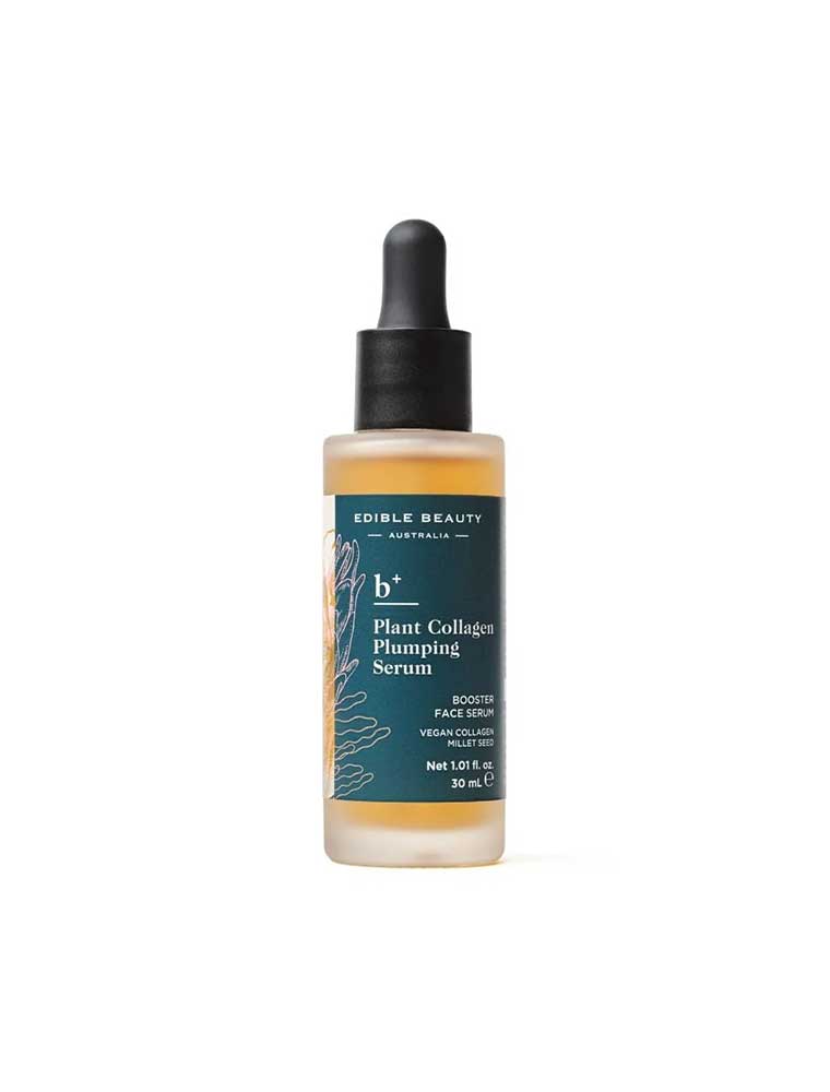 The Edible Beauty Plant Collagen Plumping Booster Serum combines innovative plant technology with powerful native ingredients. This advanced formula features wild-crafted Type I Plant Collagen, clinically shown to decrease wrinkle depth by 19% in 30 minutes, alongside Millet Seed and Oak Extracts that strengthen the collagen matrix. Enhanced with vitamin-rich Australian Kelp, antioxidant Davidson Plum, and super-potent Aniseed Myrtle (100x more powerful than Vitamin C), plus Dragon Fruit Extract for additional firming. Perfect for addressing signs of ageing, this comprehensive serum visibly lifts skin by 2.54mm in 28 days while improving brightness by 25% and supporting long-term collagen production. Made in Australia, vegan and packaged in glass.