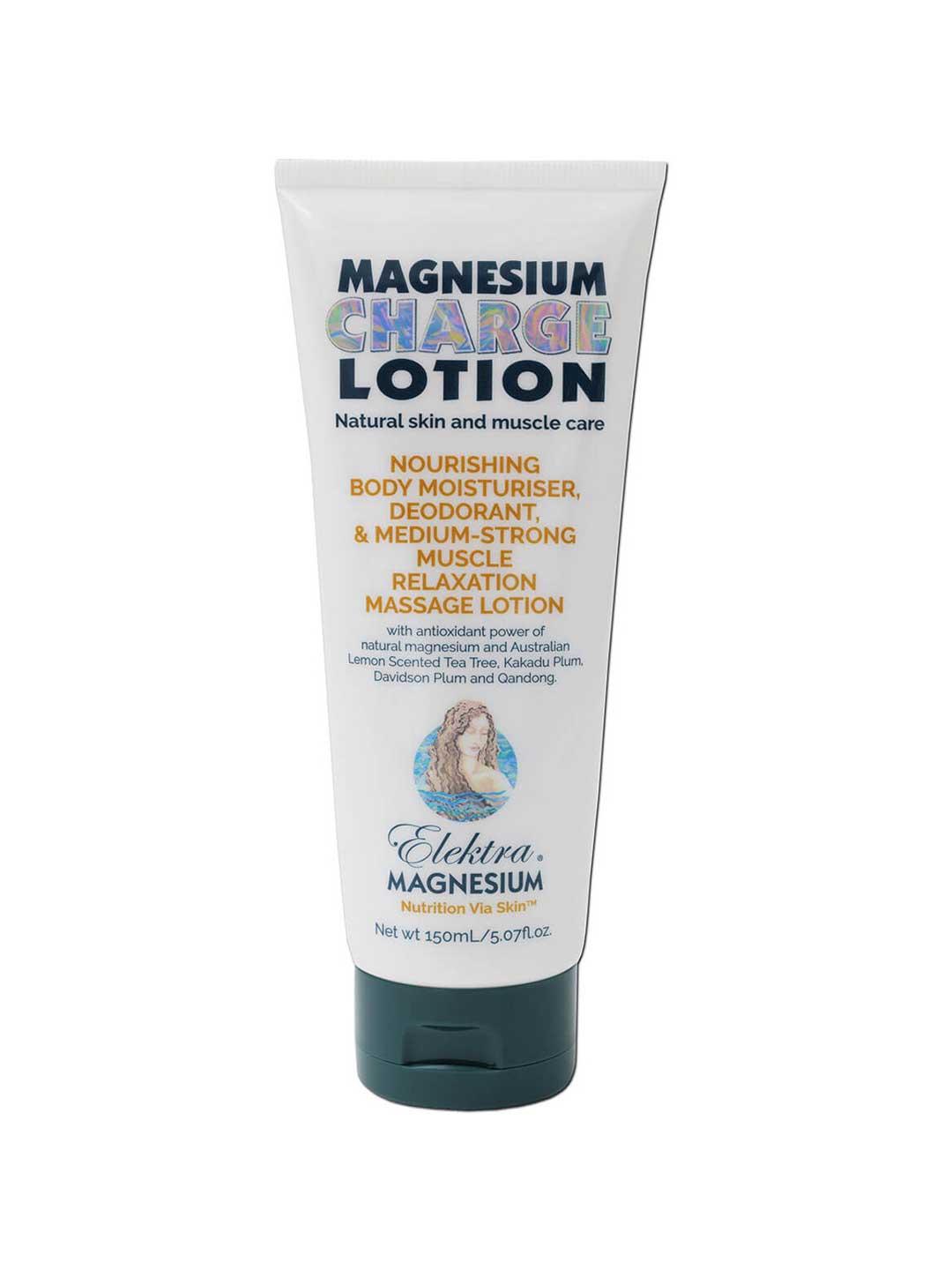The Elektra Magnesium Charge Lotion is a high-strength formula with a 30% concentration of magnesium chloride salt, delivering approximately 300mg of elemental magnesium per teaspoon. Its silky, light texture is ideal for active people, providing fast action when massaged into muscles to relieve tightness and support performance and recovery. The formula features Hyaluronic Acid for hydration and powerful Australian botanicals like Kakadu Plum, Davidson Plum, and Quandong for antioxidant support. With a fresh aroma of lemon-scented tea tree, it absorbs beautifully, leaving no sticky residue. Made in Australia and vegan.