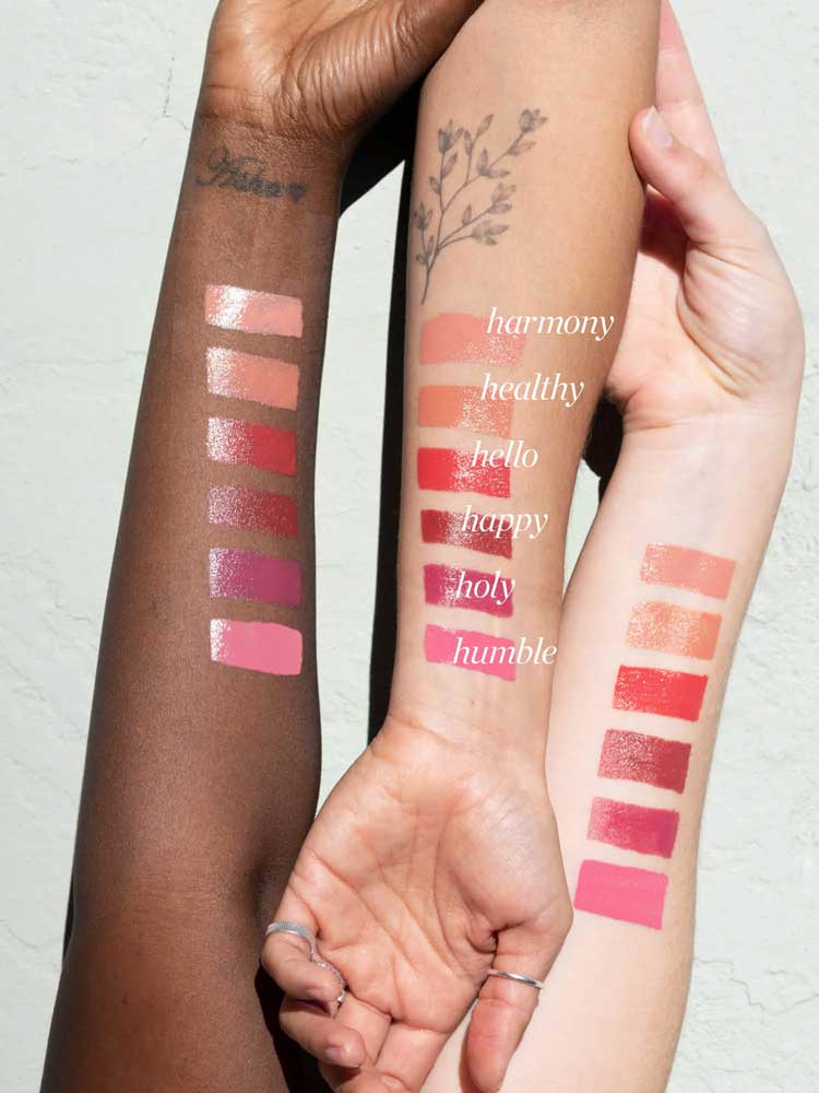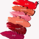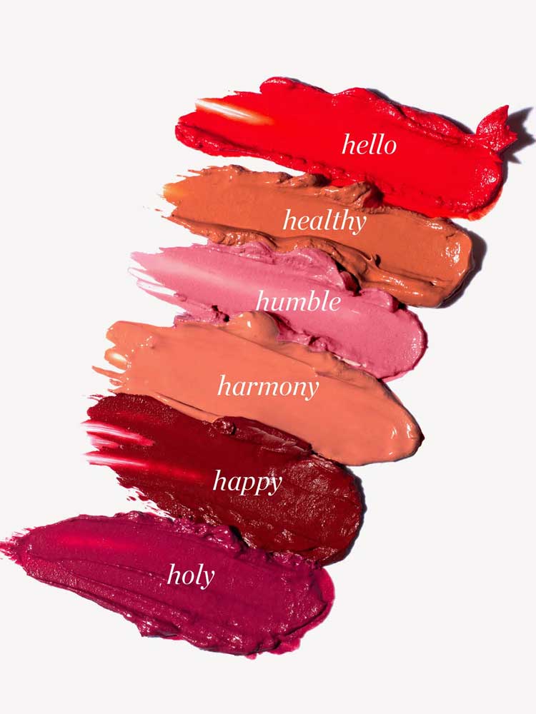 Available in 6 shades: Harmony (dusty pink), Happy (crimson red), Humble (dolly pink), Healthy (creamy caramel), Holy (rich grape), Hello (poppy flower).