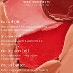 ricinus communis (castor) oil, euphorbia cerifera (candelilla) wax, simmondsia chinensis (jojoba) oil, caprylic/capric triglyceride, persea gratissima (avocado) oil, theobroma cacao (cocoa) butter, daucus carota sativa (carrot) oil, magnesium stearate, tocopheryl acetate (vitamin e). May contain +/- CI 77491, CI 77492, CI 77499 (iron oxides), CI 77019 (mica), CI 77891 (titanium dioxide).