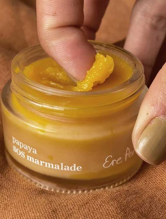 The Ere Perez Papaya SOS Marmalade is a healing balm enriched with antioxidant-rich Fermented Papaya, nourishing Chia, Coconut and Hemp Oils, and soothing Calendula. This skin-loving formula helps comfort the appearance of dry patches, bites, spots and minor skin irritations while delivering essential nutrients including Zinc, Magnesium and Potassium. Perfect for face, body and hair, this multipurpose balm provides immediate comfort and hydration wherever needed, making it an essential addition to your skincare routine. Vegan.