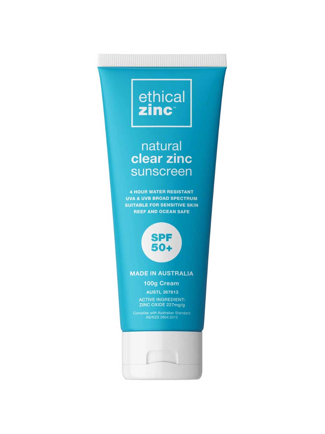 The Ethical Zinc SPF50+ Natural Clear Zinc Sunscreen is a high protection sunscreen water resistant for up to 4 hours. It is formulated with certified natural non-nano Zinc Oxide, providing SPF 50+ UVA and UVB rays ideal for beach days, swimming or other water-based activities. It has a light Vanilla aroma. Made in Australia, preservative, Ocean & Reef Safe.