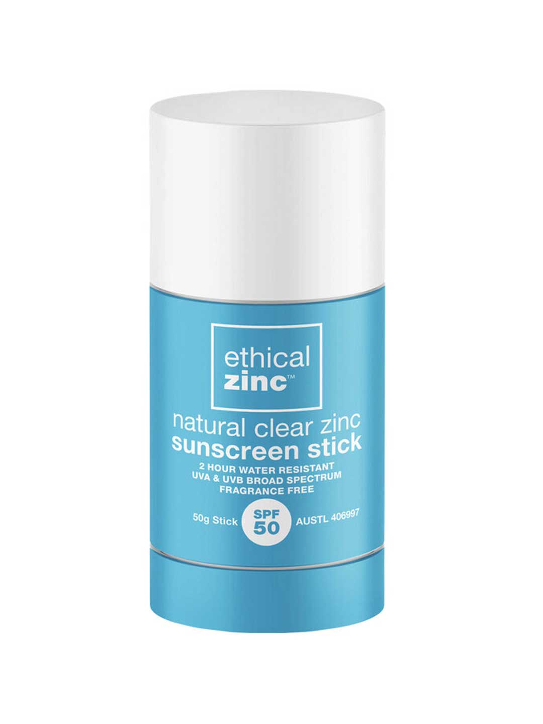 The Ethical Zinc SPF50 Natural Clear Zinc Sunscreen Stick is a convenient, mess-free sunscreen formulated with certified natural non-nano Zinc Oxide. It provides SPF 50 broad spectrum protection against UVA and UVB rays, ideal for on-the-go application. Water resistant for up to 2 hours, it is fragrance free and preservative free, suitable for all skin types including sensitive skin. Made in Australia, preservative, Ocean & Reef Safe.