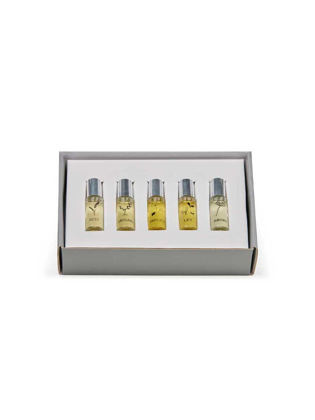 A discovery box featuring five 5ml perfume oil samples: Amplify (woody spicy), Aware (fresh herbaceous), Ground (warm earthy), Lift (uplifting citrus) and Rest (calming floral).