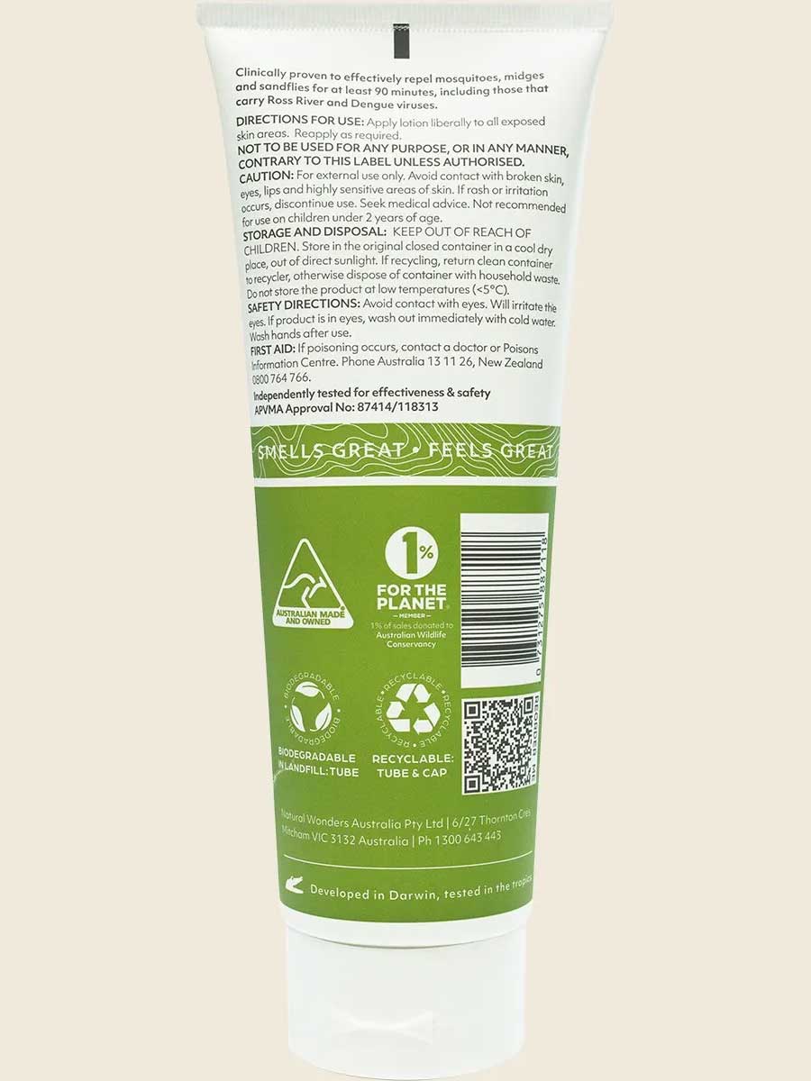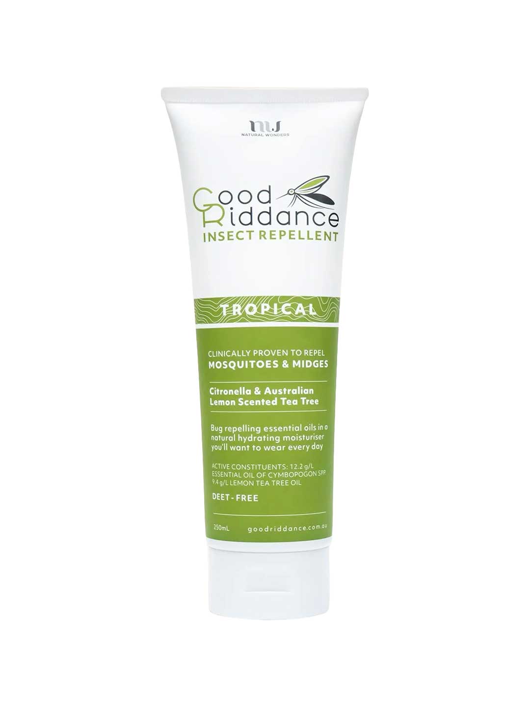 Active Constituent: 360g/L Oil of Lemon Eucalyptus (Hydrate, Cyclized). 100% Natural ingredients: Purified Water, Sunflower Oil, Organic Shea Butter, Organic Cocoa Butter, Jojoba Oil, Beeswax, Natural Olive Emulsifying Wax, Stearic Acid, Cetyl Alcohol, Organic Vegetable Glycerin, Sclerotium Gum, Sodium Benzoate, Potassium Sorbate, Natural Tocopherol, Citric Acid, Sodium Phytate, Vanillin, Good Riddance Tropical proprietary blend.