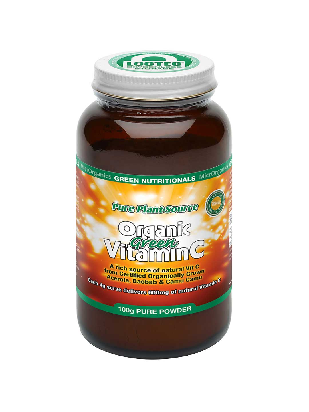 The Green Nutritionals Organic GreenVITAMIN C is a blend of pure, certified organically grown Acerola, Baobab and Camu Camu all rich in natural vitamin C and synergistic nutrients. This high-potency blend of organic superfoods provides 600mg of natural Vitamin C in every serve, different to synthetic vitamin C which contains highly processed, isolated ascorbates. Contains no added synthetic Ascorbic Acid, no added sugars, no added sweeteners, no artificial colour or flavours. Essential for collagen synthesis to build strong connective tissue, carnitine synthesis for fatty acid metabolism, neurotransmitter function and immune system function. Helps boost immunity, regulate blood sugar, support weight loss, acts as a potent antioxidant, and helps reduce effects of stress. Made in Australia, certified organic vegan and packaged in glass.