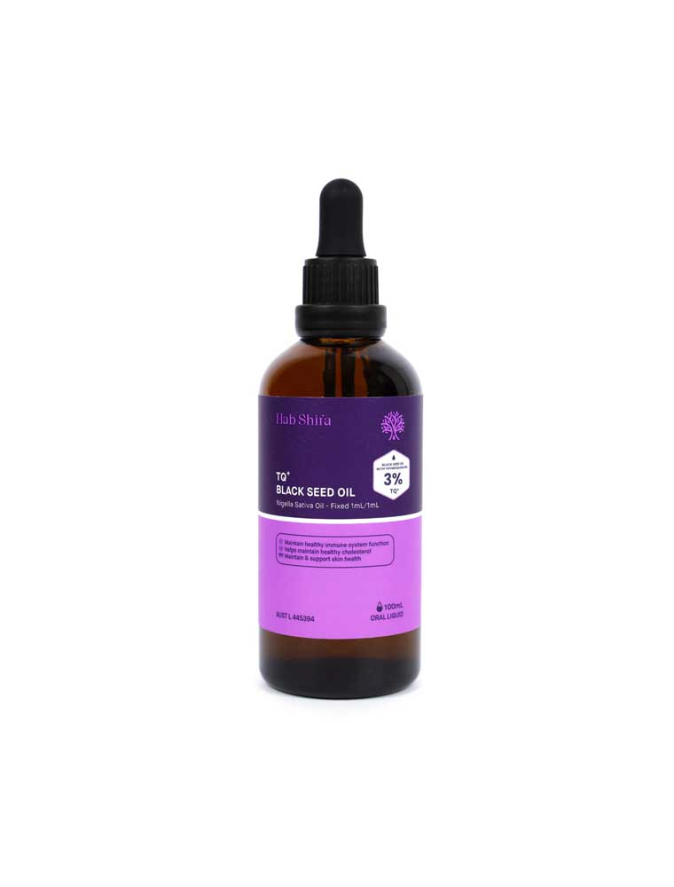 The HAB Shifa Black Seed Oil 3% TQ+ 100ml allows you to experience the enhanced power of TQ+ Black Seed Oil, rich in Thymoquinone. Rich in potent antioxidants to fortify your health and vitality, this oil embraces nature's solution for a healthier, more vibrant you. Enhanced with 3% Thymoquinone for superior antioxidant and anti-inflammatory benefits, this oil hydrates, nourishes, and soothes dry skin whilst stimulating hair growth and restoring shine. For internal wellness, it supports immune health, cardiovascular function, and joint mobility when taken orally. This 100% pure, organic, cold-pressed black seed oil ensures maximum potency and purity with easy application via precision dropper for accurate, mess-free use. Made in Australia, vegan and packaged in glass. TGA Listed (AUST L 445394). ALWAYS READ THE LABEL. FOLLOW THE DIRECTIONS FOR USE.