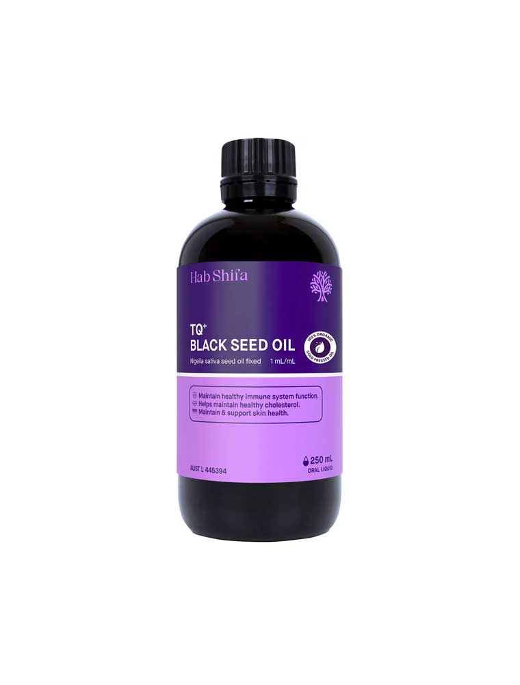 The HAB SHIFA TQ+ Organic Black Seed Oil is packed full of antioxidants, vitamins and naturally occurring constituents that make it a unique supplement to support a healthy immune system. This Black Seed Oil is 100% pure and highly bioavailable containing TQ levels within the science supported range. Containing 100% Pure Nigella Sativa Oil, HAB SHIFA Black Seed Oil is carefully harvested and extracted with a cold-press method in order to ensure the oil is of the highest standards. TQ+ Black seed oil contains Nigella sativa, a source of the active component Thymoquinone. Black seed oil is an ancient remedy, which is now more commonly known for its modern uses of supporting healthy immune system function and maintaining healthy cholesterol. Made in Australia, vegan and packaged in glass. TGA Listed (AUST L 445394). ALWAYS READ THE LABEL. FOLLOW THE DIRECTIONS FOR USE.