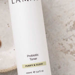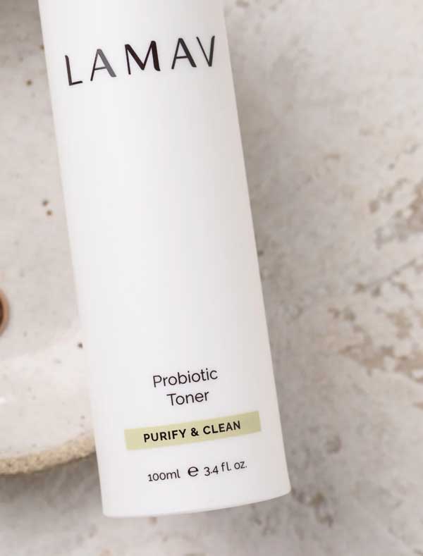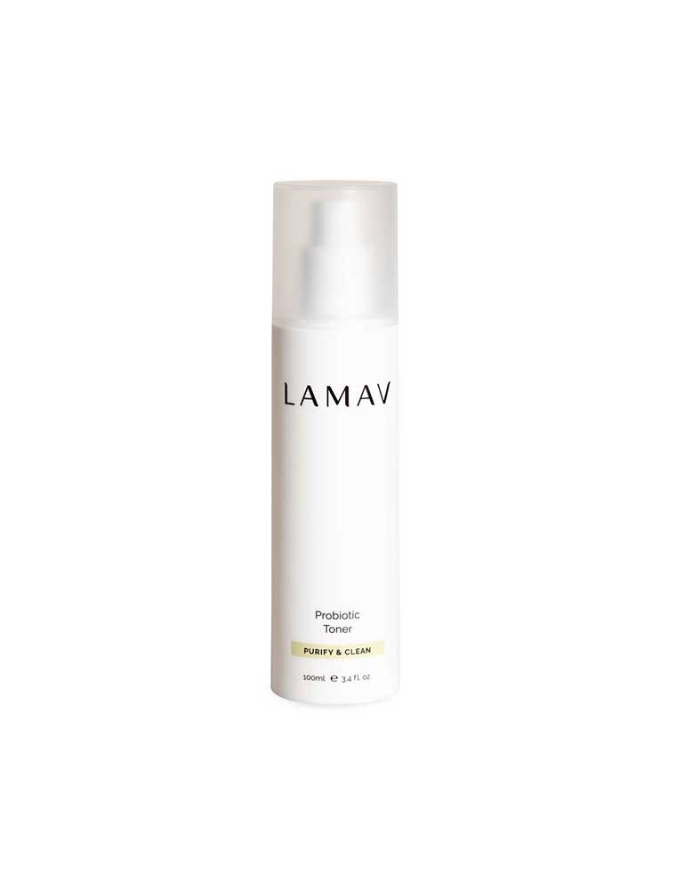 The LAMAV Probiotic Toner is a unique blend of probiotics that helps to balance the skin's microbiome for a vibrant, healthy complexion. Alpha Hydroxy Acids assist in improving cell turnover and stimulating collagen production whilst helping to calm redness to reveal a clearer complexion. The probiotics stimulate skin renewal, help restore radiance, and assist in regeneration while supporting the skin's barrier function. Enhanced with Lilly Pilly Extract rich in Vitamin C to brighten. Part of the Purify & Clean range designed to minimise the appearance of blemishes. Made in Australia, certified organic and vegan.