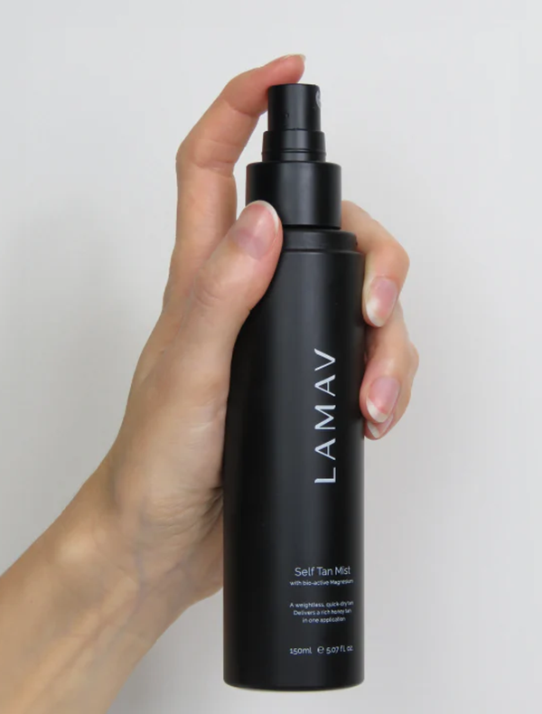 The LAMAV Self Tan Mist is a weightless, quick-dry formulation that delivers a rich honey tan in one mess-free application. Suitable for use on face and body, this organic tanning mist is infused with Magnesium, botanicals and macadamia oil, instantly delivering hydration and wellbeing benefits. Made with all-natural DHA for a flawless, golden tan with no colour transfer or fake-tan smell. The quick-drying formula ensures no sticky residue whilst delivering a beautiful, natural-looking tan. Made in Australia, certified organic, vegan and packaged in glass.