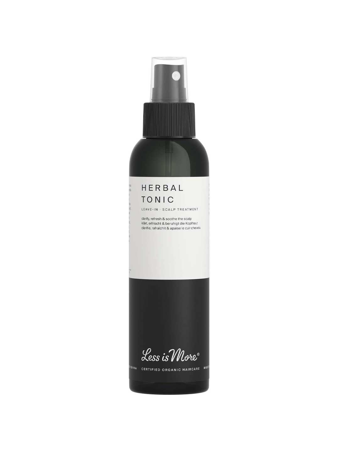 The Less Is More Herbal Tonic is a leave-in scalp treatment designed to refresh, clarify, and soothe irritated or imbalanced scalps. A blend of six traditional botanical extracts works to support scalp health, including Neem to comfort dry scalps, Calendula to soothe sensitivity, Nettle to help balance oil production, Birch to support fine or thinning hair, Melissa to promote a healthy scalp environment, and Horsetail to support hair strength. This invigorating tonic helps calm irritation while leaving the scalp feeling refreshed and clear without heaviness. Certified organic and vegan, this silicone free scalp tonic is sustainably handmade and produced in Vienna, Austria. It is scented with 100% certified organic essences of Rosemary, Lavender, and Immortelle.