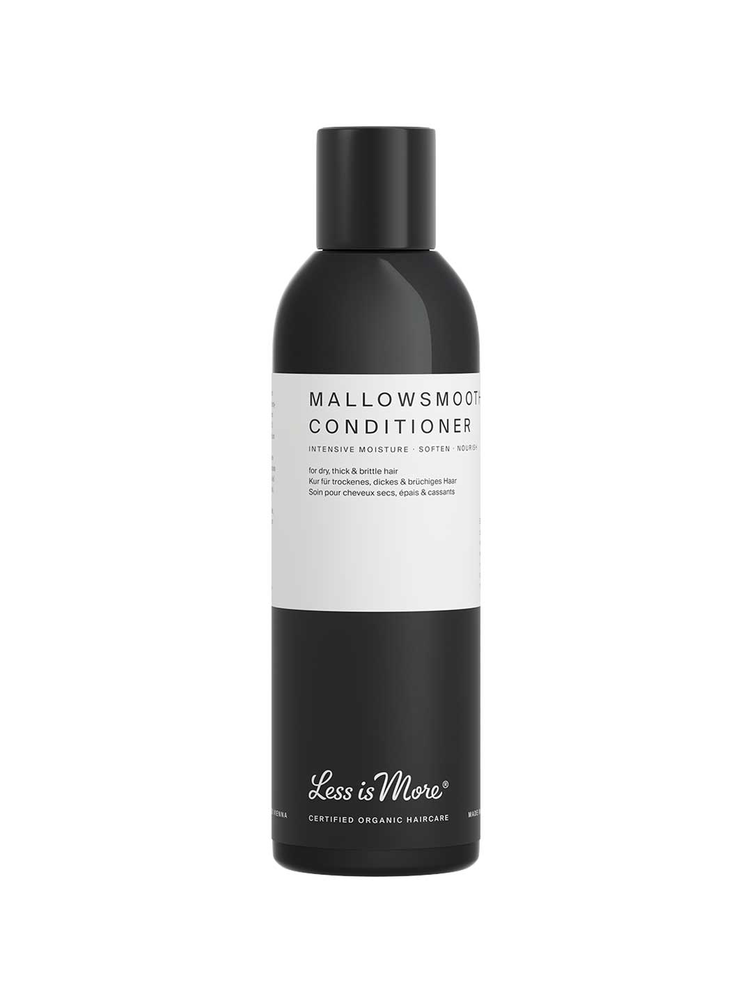 The Less Is More Mallowsmooth Conditioner is a rich, intensive moisture conditioner designed for dry, thick, and brittle hair that needs deep nourishment and improved manageability. Rose Hip Seed Oil helps restore softness and moisture, while traditional Mallow extract smoothes the hair structure and adds a silky feel. Virgin Coconut Oil deeply conditions the hair from within, helping improve combability and protect against dryness. Certified organic and vegan, this sulphate free, silicone free conditioner is sustainably handmade and produced in Vienna, Austria, and scented with 100% certified organic essences of Ylang Ylang, Palmarosa, Rose Geranium, and Tangerine.