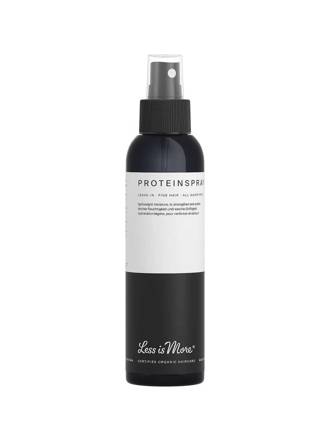 The Less Is More Protein Spray is a lightweight leave-in conditioning spray designed for fine hair and all hair types that need moisture, softness, and manageability without weight. Wheat Proteins help support the hair structure and add natural volume, while Horsetail extract supports strength from the roots and helps balance the scalp. Aloe Vera juice provides lightweight hydration, and Rose Water offers a smoothing effect, leaving hair with a soft texture and taming flyaways and frizz. Certified organic, vegan, sulphate free, silicone free, and sustainably handmade and produced in Vienna, Austria. It is scented with 100% certified organic essences of Rose Geranium, Ylang Ylang, and Orange.