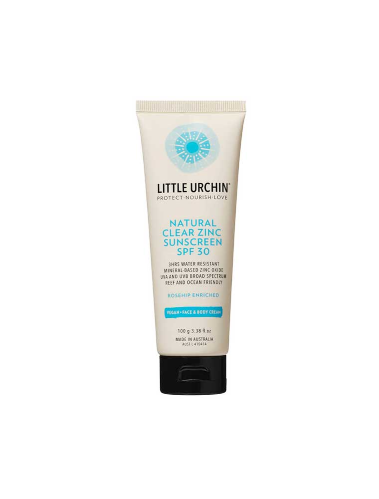 The Little Urchin Natural Clear Zinc Sunscreen SPF 30 provides broad-spectrum UVA and UVB protection. Formulated with Zinc Oxide and enriched with Rosehip oil in a nourishing 3 hour water-resistant blend. Suitable for the whole family from 6 months and older and ideal for the face and body. Made in Australia and vegan. TGA Listed (AUST L 410414). ALWAYS READ THE LABEL. FOLLOW THE DIRECTIONS FOR USE. Sunscreen is only one part of sun protection; wear protective clothing and seek shade. Avoid prolonged sun exposure and reapply frequently.