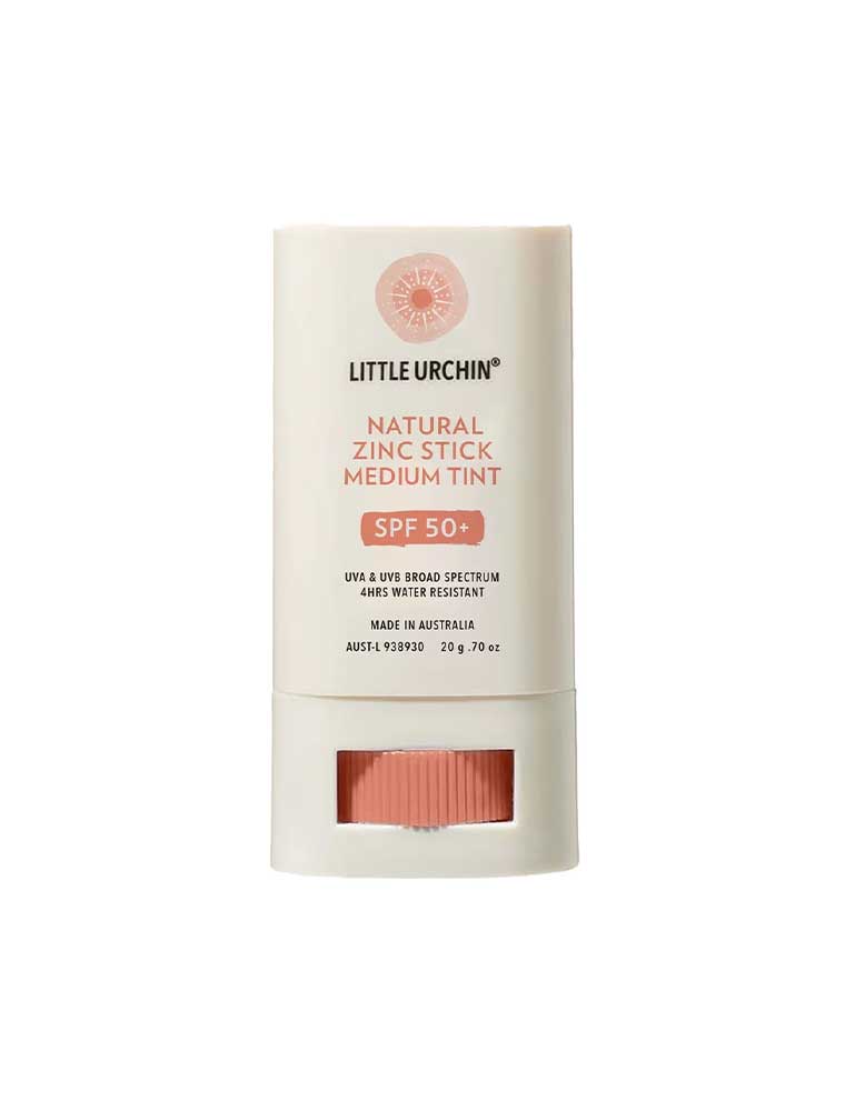 The Little Urchin Natural Zinc Stick Medium Tint SPF 50+ provides broad-spectrum UVA and UVB protection in a blendable medium-tinted coverage, ideal for all skin types. This innovative formula combines Zinc Oxide with nourishing botanicals and is four hours water-resistant. Ideal for active lifestyles and daily face protection, this non-greasy and mess-free stick applies smoothly with a natural finish. Made in Australia and vegan. TGA Listed (AUST L 410415). ALWAYS READ THE LABEL. FOLLOW THE DIRECTIONS FOR USE. Sunscreen is only one part of sun protection; wear protective clothing and seek shade. Avoid prolonged sun exposure and reapply frequently.