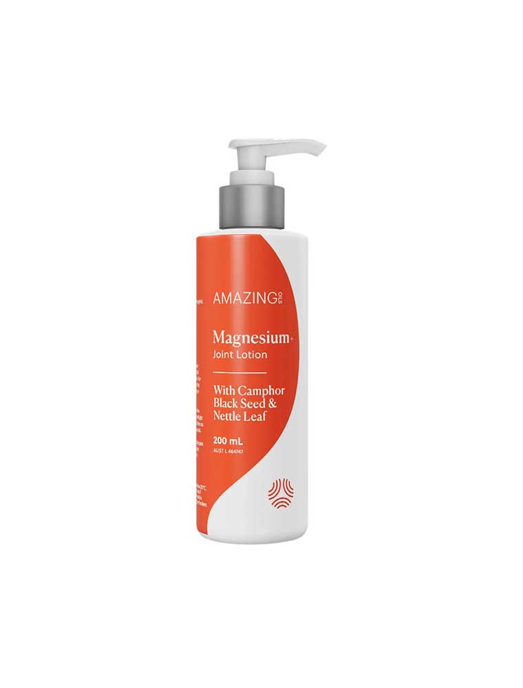 The Amazing Oils Magnesium+ Joint Lotion is a topical magnesium that combines high-grade magnesium chloride with camphor, black seed, and ginger. These ingredients have been traditionally used in Western herbal medicine to relieve symptoms of mild arthritis, decrease mild joint pain and inflammation, enhance joint mobility and flexibility and aid management of muscle sprains. This fast-absorbing, non-greasy lotion delivers approximately 100mg of elemental magnesium per 2-3 pumps. Made in Australia and vegan. TGA Listed (AUST L 464747). ALWAYS READ THE LABEL AND FOLLOW THE DIRECTIONS FOR USE. If symptoms persist, talk to your health professional.