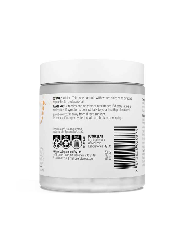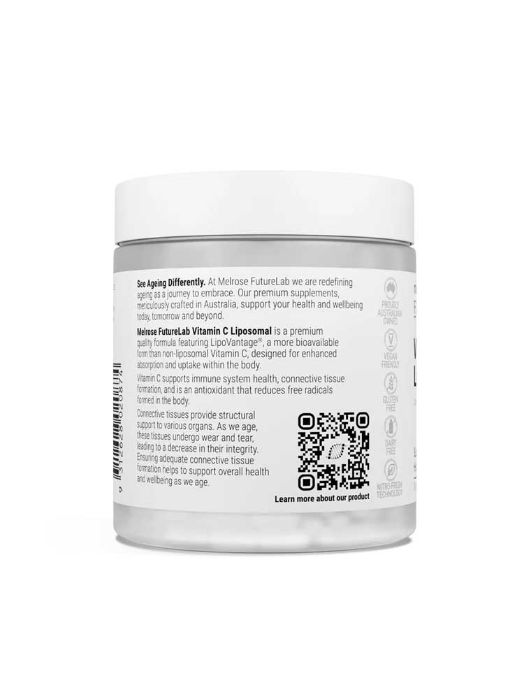 Melrose FutureLab Vitamin C Liposomal features LipoVantage, a more bioavailable form than non-liposomal Vitamin C for enhanced absorption. Supports immune system health, connective tissue formation, and provides antioxidant protection by reducing free radicals formed in the body. Made in Australia. TGA Listed (AUST L 447230). ALWAYS READ THE LABEL AND USE ONLY AS DIRECTED. If symptoms persist, talk to your health professional.
