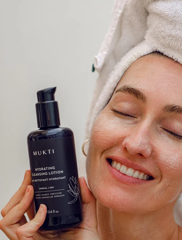 The Mukti Hydrating Cleansing Lotion is a nourishing cream cleanser that combines powerful Australian botanicals with rich plant oils. This gentle formula features Vitamin C-rich Kakadu Plum and antioxidant Mountain Pepper Berry, alongside moisturising Macadamia Nut oil and Shea Butter to cleanse without disrupting the skin barrier. The medium-weight lotion carries a sweet floral and vanilla scent, leaving skin soft and radiant. Ideal for normal to dry skin types. Made in Australia, certified organic, vegan and packaged in glass.