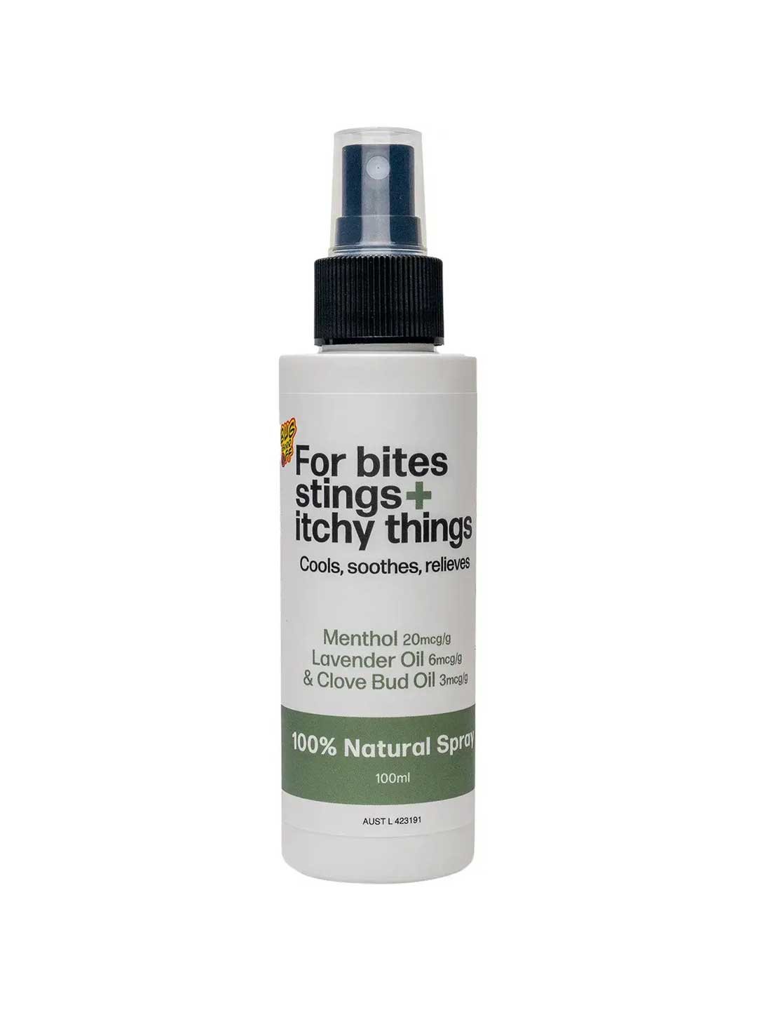 Bug-Grrr Off For bites stings + itchy things is a 100% natural spray designed to provide comfort for a wide range of insect bites, stings and plant irritations. This clear spray combines three active ingredients: Menthol to help with skin sensitivity to discomfort and itching, Clove Bud Oil and Lavender Oil for soothing effects. It also contains Basil Oil for its calming properties, plus Rosemary Oil. Suitable for Children from 6 months of age. It's supportive for discomfort caused by bees, ants, wasps, mosquitoes, sandflies, nettles and vines.
