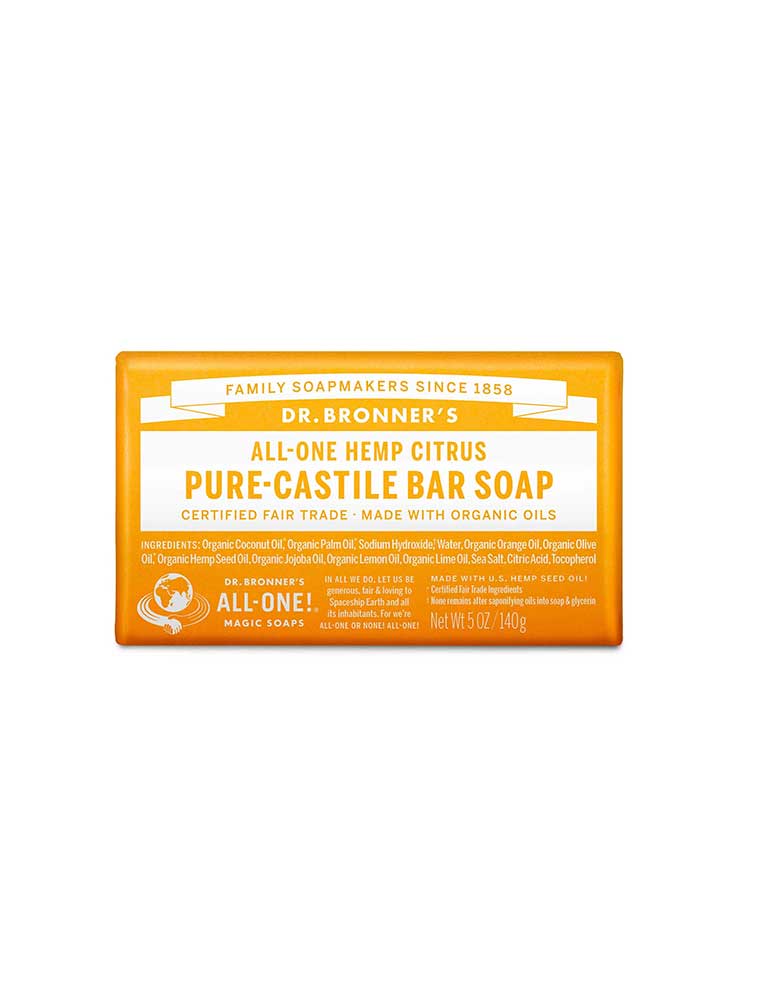The Dr. Bronner's Pure-Castile Bar Soap in Citrus is fresh and bright smelling with an invigorating blend of organic Orange, Lemon and Lime oils. Made with certified fair trade ingredients and organic Hemp oil for a soft, smooth lather that won't dry your skin. This versatile bar can be used for hands, face, body, makeup removal, hair washing, bath, shaving, teeth cleaning and foot baths. Use whole, grated or as soap cream, grate with a medium-to-fine kitchen grater and dissolve in warm to hot water, or dice into cubes and soak in water for 24 hours then blend to create foamy gel. For body use, lather on wet hands or washcloth. For hair, rub wet bar into very wet hair, lather and rinse, then follow with Dr. Bronner's Citrus Organic Hair Rinse or diluted apple cider vinegar. Add grated soap to running bath water or create shaving lather directly on skin. Made in the USA, vegan and 100% biodegradable.