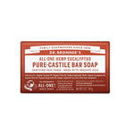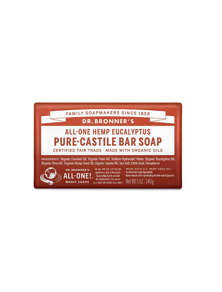 The Dr. Bronner's Pure-Castile Bar Soap in Eucalyptus is earthy and warm, with a powerful menthol burst to focus the mind. Scented purely with organic Eucalyptus oil and made with certified fair trade ingredients and organic Hemp oil for a soft, smooth lather that won't dry your skin. This versatile bar can be used for hands, face, body, makeup removal, hair washing, bath, shaving, teeth cleaning and foot baths. Use whole, grated or as soap cream, grate with a medium-to-fine kitchen grater and dissolve in warm to hot water, or dice into cubes and soak in water for 24 hours then blend to create foamy gel. For body use, lather on wet hands or washcloth. For hair, rub wet bar into very wet hair, lather and rinse, then follow with Dr. Bronner's Citrus Organic Hair Rinse or diluted apple cider vinegar. Add grated soap to running bath water or create shaving lather directly on skin. Made in the USA, vegan and 100% biodegradable.