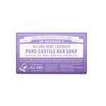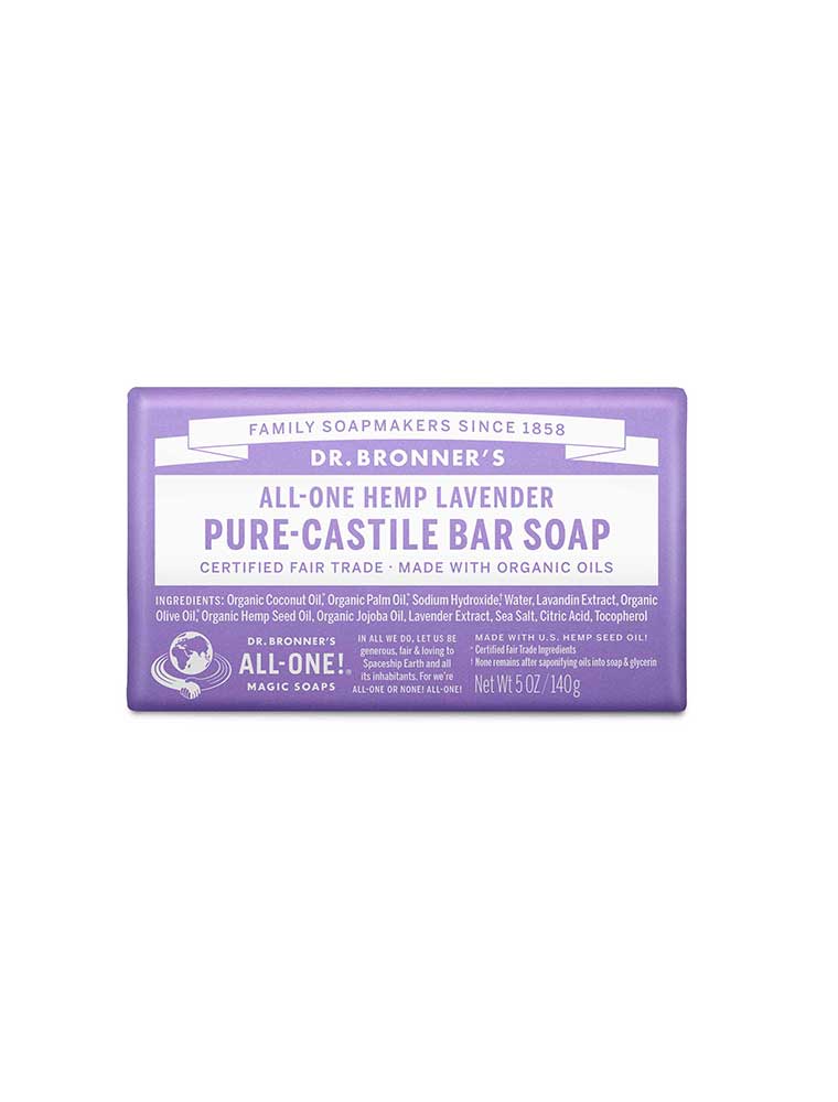 The Dr. Bronner's Pure-Castile Bar Soap in Lavender is scented with pure Lavender and Lavandin oils to calm the mind and soothe the body. Made with certified fair trade ingredients and organic Hemp oil for a soft, smooth lather that won't dry your skin. This versatile bar can be used for hands, face, body, makeup removal, hair washing, bath, shaving, teeth cleaning and foot baths. Use whole, grated or as soap cream, grate with a medium-to-fine kitchen grater and dissolve in warm to hot water, or dice into cubes and soak in water for 24 hours then blend to create foamy gel. For body use, lather on wet hands or washcloth. For hair, rub wet bar into very wet hair, lather and rinse, then follow with Dr. Bronner's Citrus Organic Hair Rinse or diluted apple cider vinegar. Add grated soap to running bath water or create shaving lather directly on skin. Made in the USA, vegan and 100% biodegradable.