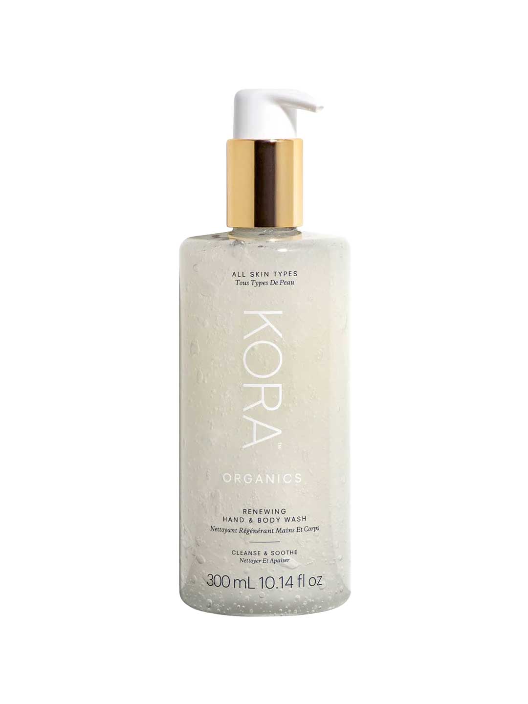 The KORA Organics Renewing Hand & Body Wash is an organic body wash that uses plant-derived surfactants to gently wash your skin whilst replenishing it with antioxidant-rich botanicals and essential fatty acids that help maintain skin's natural moisture barrier. This sulphate free body wash is infused with superfoods Cauliflower Mushroom, Aloe, Noni and Murumuru to help organically bind moisture to your skin even after rinsing. This renewing formula washes without stripping or drying, leaving skin feeling refreshed and renewed. Packed with antioxidant-rich botanicals and essential oils including Rose, Geranium and Basil to soothe your senses and spirit. Made in the USA, certified organic and vegan.